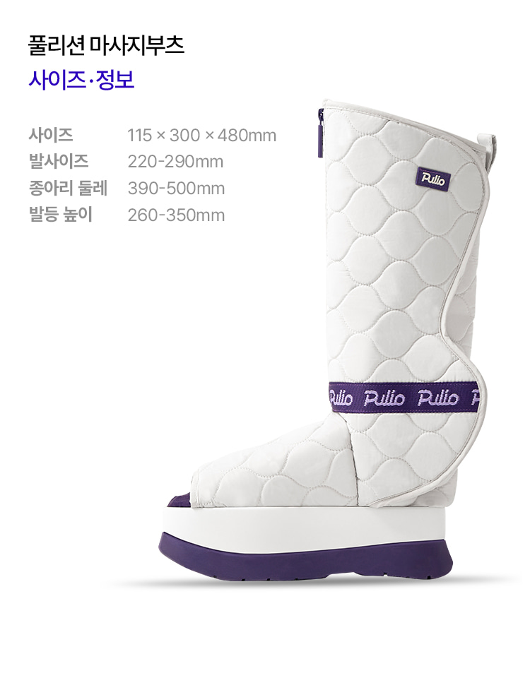 풀리오 풀리션 마사지 부츠가 여러분의 다리 고민을 시원하게 해결해 드립니다. 풀리오 풀리션 마사지 부츠는 혁신적인 기술과 인체공학적인 디자인으로 발끝부터 종아리까지 빈틈없이 마사지하여 다리 부종 완화, 피로 회복, 혈액 순환 개선에 도움을 줍니다. 마치 전문 마사지사에게 마사지를 받는 듯한 시원함을 집에서 편안하게 느껴보세요!