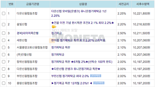 지금 일반은행권 정기예금이율은 0.6%정도 이고요. 신협, 저축은행 정기예금금리는 2%정도되네요. 위는 이율 높은 곳 비교표에요. 가장 높은 곳은 다온신용협동조합으로 2.25%프로 네요. 수도권에서는 세한신협이 2.1%프로고요.